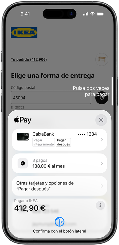 Apple Pay te ofrece flexibilidad al pagar en tiendas con el iPhone, o con el iPhone o el iPad online y en apps. Puedes pagar de una vez o dividir el importe en cuotas con una tarjeta válida.2