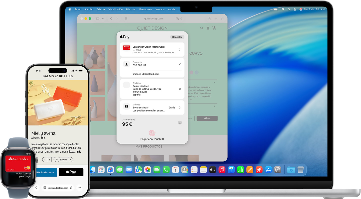 • Pagar con Apple Pay es más seguro que utilizar una tarjeta de crédito, débito o prepago. Para poder pagar con el iPhone, Apple Watch, Mac o iPad necesitas confirmar la operación con Face ID, Touch ID o tu código. Apple Pay no comparte el número de tu tarjeta ni tu identidad, y los datos de tu tarjeta nunca quedan almacenados en los servidores de Apple.